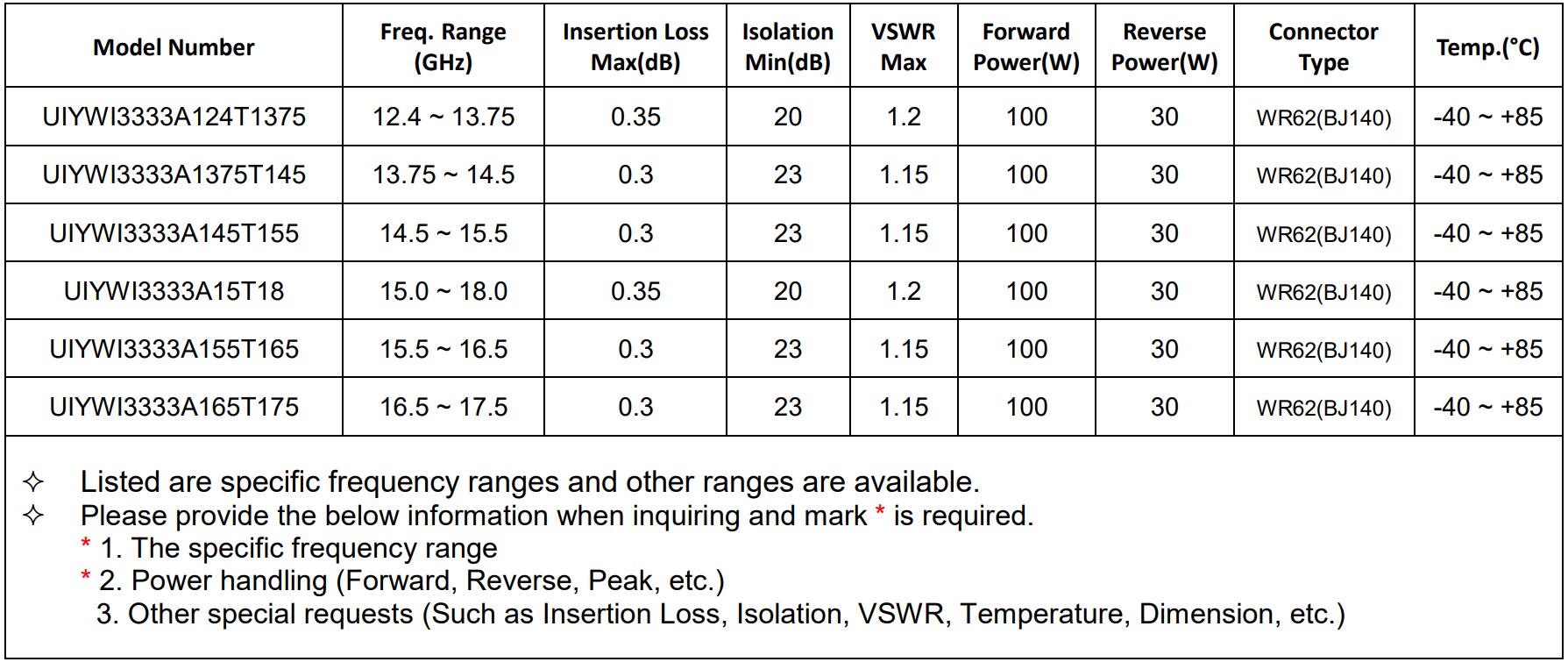 UIY Waveguide Isolators provide multiple size options, high frequency band and wide frequency range (2.4Ghz-110GHz.). Meanwhile, we provide flexible customization to project requirements.