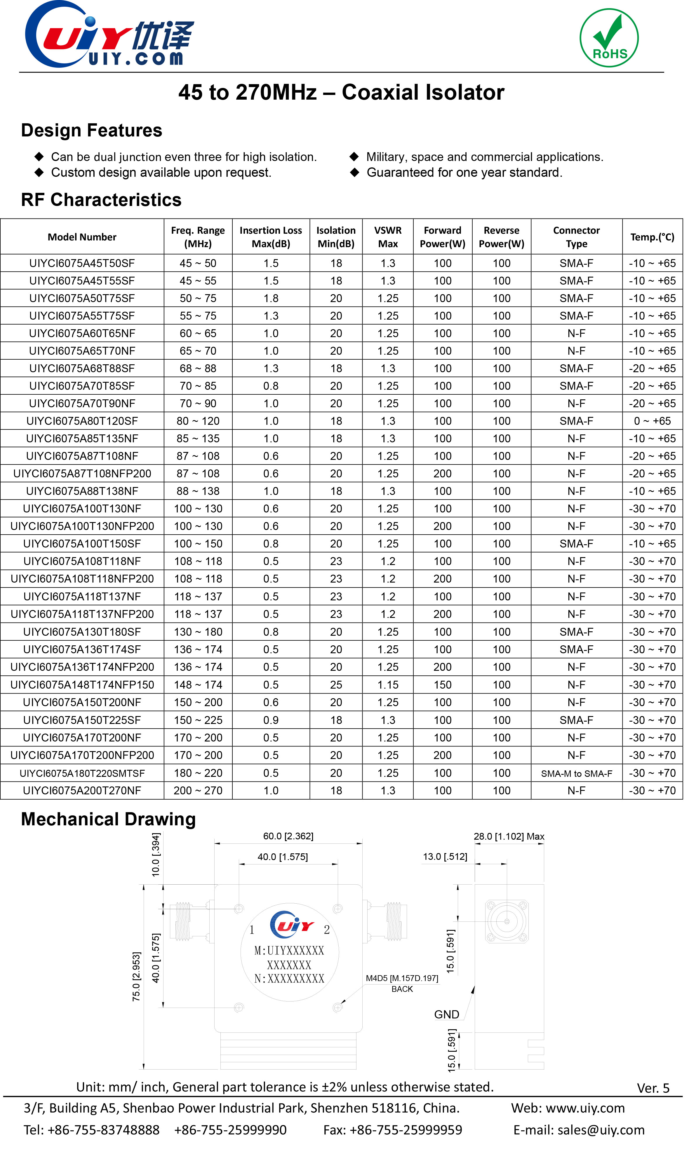 | UIYCI6075A | 45~270 | 40% | 0.35 | 23 | 1.2 | 200 | 100 | N, SMA | -30~+70 | 60×75×28 |