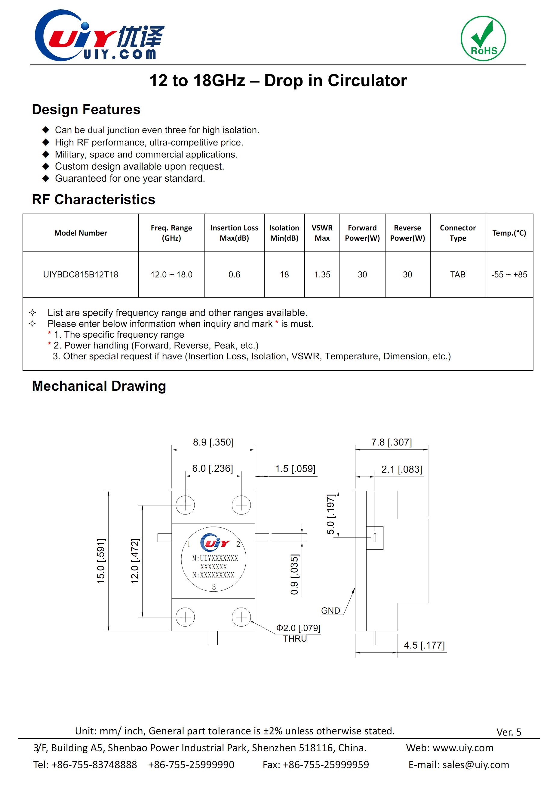 1. Due to the thickness of the original 12-18GHz Drop in Circulator, the product model of the Drop in Circulator has been updated to UIYBDC815B: