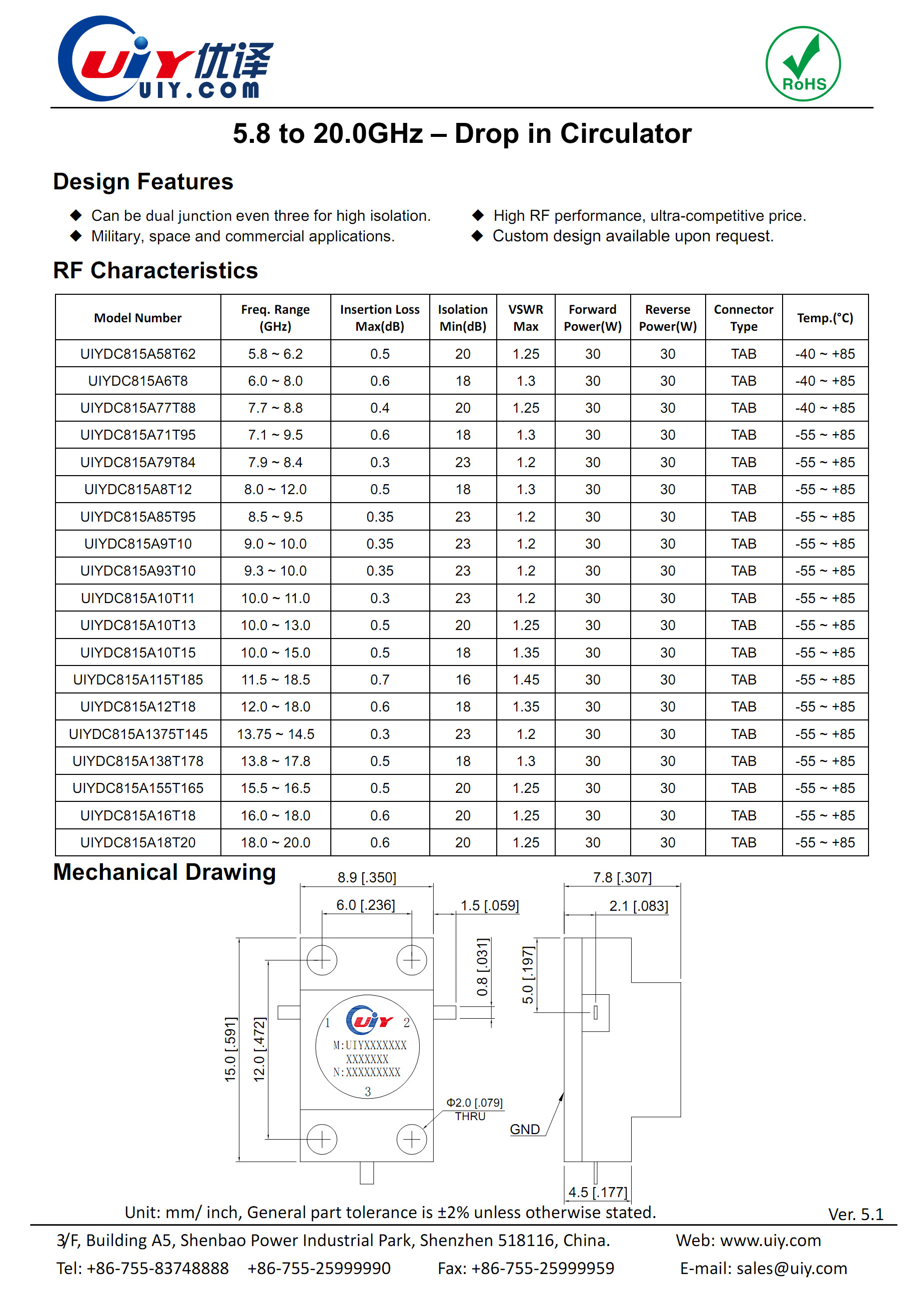 2. Suspend the production of the original model UIYDC1215A (Drop in Circulator), and change the frequency range of the model UIYDC815A (Drop in Circulator) to 5.8-20GHz: