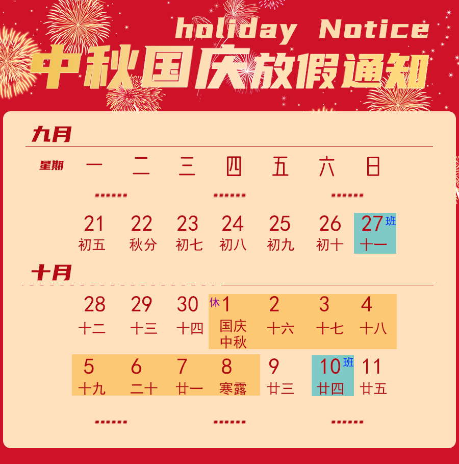 According to the provisions of the national statutory holidays, combined with the actual situation of our company, the time for the Mid-Autumn Festival and National Day holiday scheduled for 2020 is as follows: