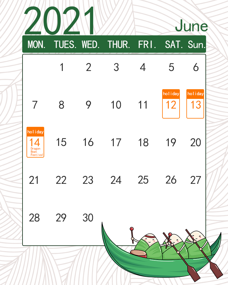 The Chinese Dragon Boat Festival is coming, according to the State Council Dragon Boat Festival holiday notice and the actual situation of our company, our holiday arrangements are as follows: June 12th~14th, 2021, 3 days in total, and resume on June 15th.