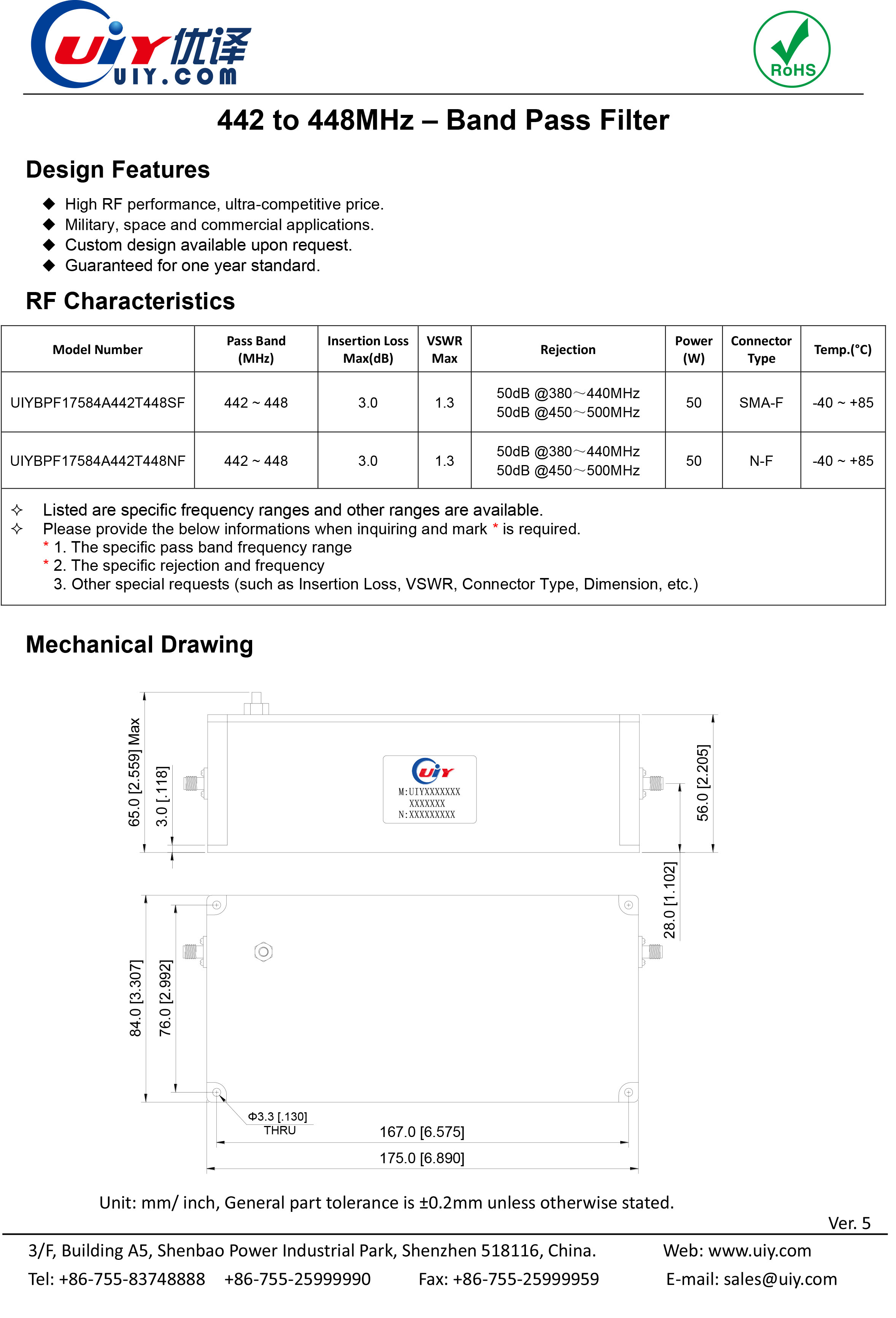 442-448MHz 带通滤波器 UIYBPF17584A442T448SF, UIYBPF17584A442T448NF