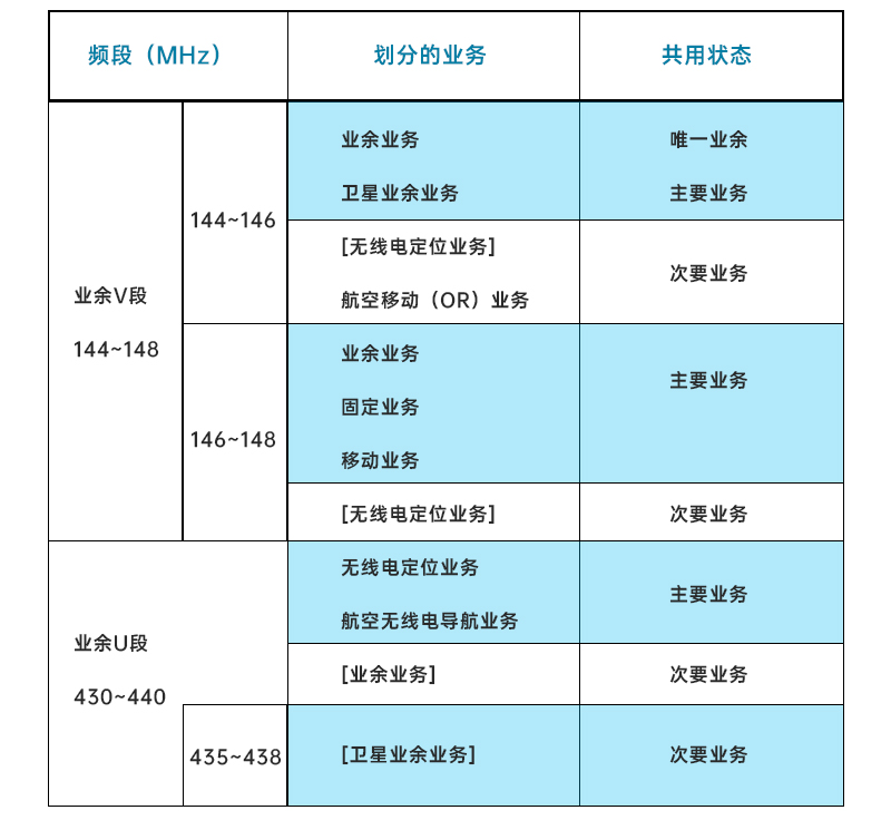 146~148MHz频段范围内,用于包括业余业务、固定业务和移动业务的主要业务、以及用于包括无线电定位业务的次要业务。