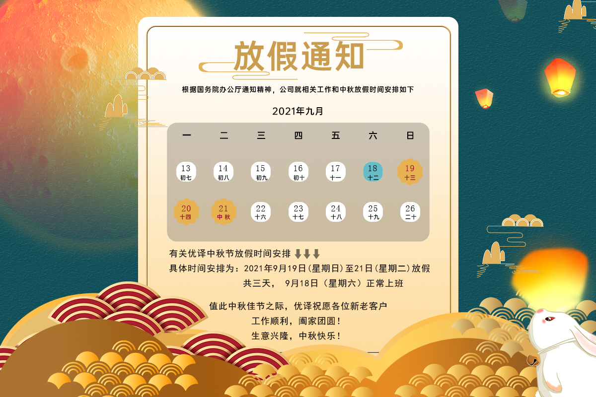 感谢您一如既往对本公司的支持。值此中秋佳节之际,优译祝愿各位客户及供应商中秋节快乐,愿您阖家幸福,生意兴隆。