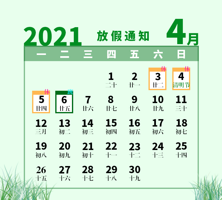 根据国务院办公厅通知精神,并结合我司的实际情况,现定于2021年4月3日(农历二月廿二)至4月5日(农历二月廿四)放假,共3天,于4月6日(星期二)全体员工正式上班。