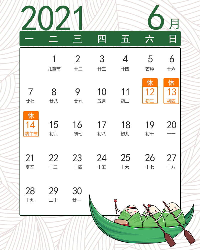2021年6月12日(农历五月初三)至6月14日(农历五月初五)放假调休,共3天,6月15日(星期二,农历五月初六)上班。